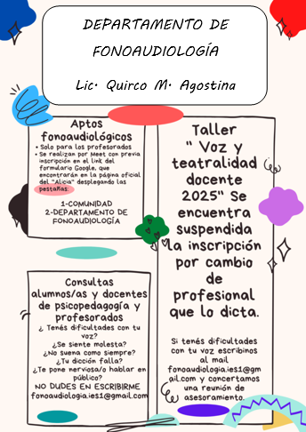 ¡Hola! Soy la Fonoaudióloga del IES N°1, y me gustaría invitarte a participar de un espacio de encuentro con tu voz a través del juego dramático… Un taller llamado “Voz y teatralidad docente” donde podrás experimentar y conocer tu voz-cuerpo expresivo docente… El propósito es brindarte herramientas para un mejor uso de la voz, teniendo la oportunidad de utilizarla con un alto rendimiento y un mínimo esfuerzo, fortaleciendo de esta forma el órgano fonador y preparándolo para un trabajo docente saludable. Conocer el funcionamiento vocal es vivenciar corporalmente sus conceptos y enterarte sobre el cuidado de su salud. Estarán presentes también ejercicios de relajación, eje, emisión, y vocalización. De acuerdo a lo que te animes, podrás cantar, recitar, leer o actuar; y traer tu propio material textual. Un espacio en el que podrás compartir tus dudas y divertirte en el aprendizaje de sus soluciones. Los talleres son gratuitos y están abiertos a toda la comunidad.
